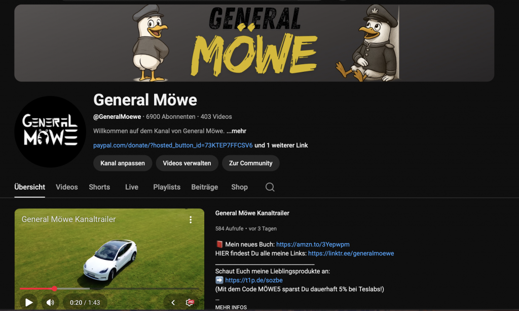 Geschichten erzählen, Gedanken festhalten, Erlebnisse teilen – genau darum geht es in den bereits veröffentlichten Büchern. Was mit YouTube- Videos begann, wurde zu etwas Dauerhaftem: Worte, die bleiben. General Möwe schreibt über alles, was ihn bewegt -Reisen, Elektromobilität, Leidenschaft, Mut und echte Erlebnisse aus dem Leben.